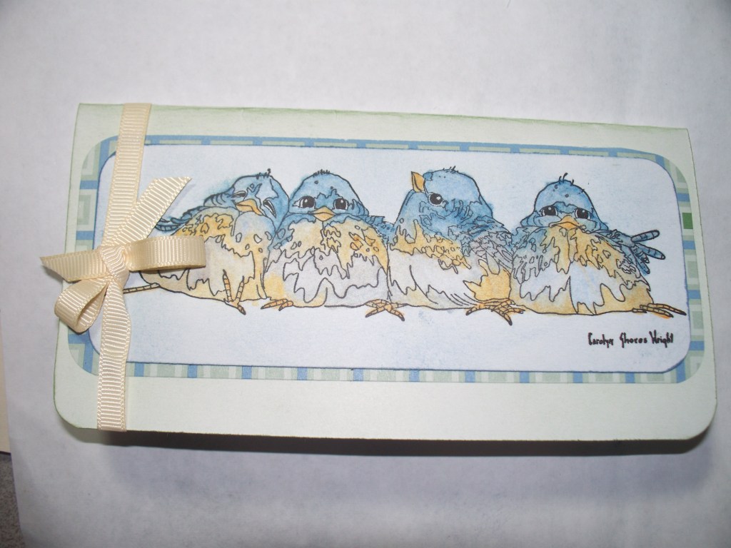 3 1/2″ x 6 1/2″ card featuring watercolor pencils by Koh-I-Noor and Carolyn Shores Wright four bluebirds wooden stamp.